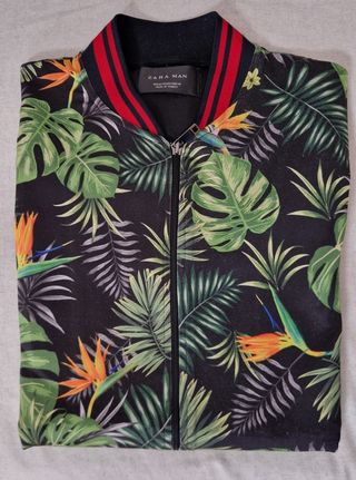 Giacca sportiva con una vivace fantasia tropicale. - Fantasia con foglie e fiori esotici. - Collo a costine con strisce rosse e nere. - Chiusura con zip frontale.