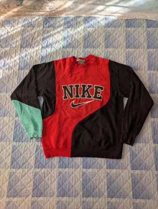Felpa vintage personalizzata Nike con un design unico. - Maniche in colori contrastanti. - Logo Nike sul davanti. Taglia M, vestibilità regolare, prezzo leggermente trattabile :)
