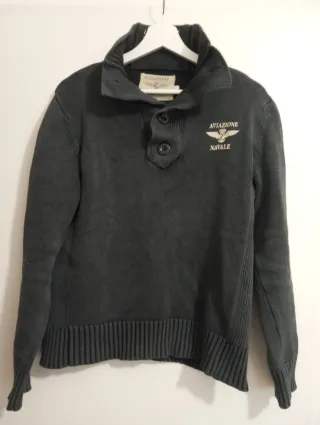 Maglione da uomo con colletto a scialle e chiusura a bottoni. - Logo Aviazione Navale ricamato sul petto. - Polsini e fondo a costine.