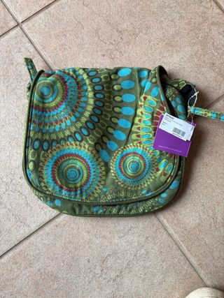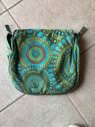 Borsa a tracolla con una vivace fantasia geometrica. - Fantasia con cerchi concentrici e pois. - Tracolla regolabile. - Chiusura con zip.