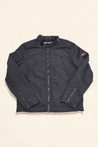 Un giubbino leggero di Tommy Hilfiger in un versatile colore nero. Perfetto per la primavera, l'estate e l'inizio autunno, o come strato sotto un cappotto più pesante. Design e Dettagli: Stile: Ispirato al mondo delle corse e al biker jacket, con un colletto alla coreana (mandarino) con bottone a pressione. Spalle: Dettagli in trapuntatura a diamante sulle spalle che aggiungono un tocco distintivo e sportivo. Logo: Iconico logo Tommy Hilfiger sul petto e toppa colorata sulla manica. Chiusure: Cerniera frontale robusta e cerniere decorative o funzionali sui polsini. Fodera: L'interno è foderato con un tessuto a rete scuro per l