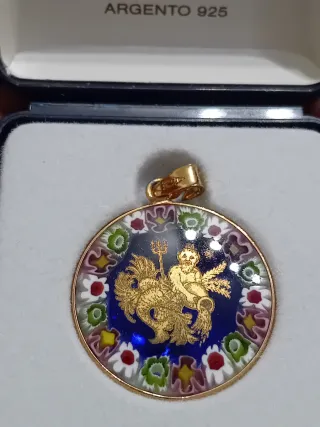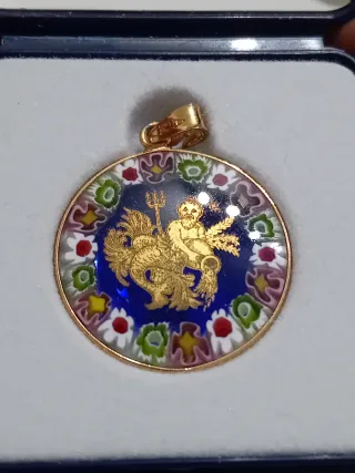 Bellissimo ciondolo con tecnica Murrina Veneziana. - Design rotondo con cornice dorata. - Decorazione centrale con figura mitologica dorata su sfondo blu. - Bordo decorato con motivi floreali colorati tipici della murrina.