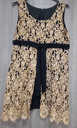 Elegante casacca con un raffinato design. - Tessuto in pizzo dorato. - Dettagli in nero. - Cintura in vita per un look definito.