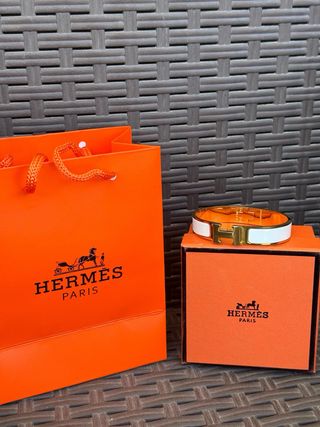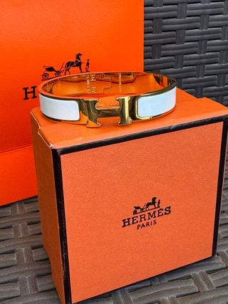 Elegante bracciale Hermès con finitura oro e inserti bianchi. - Design iconico a H. - Materiale di alta qualità.