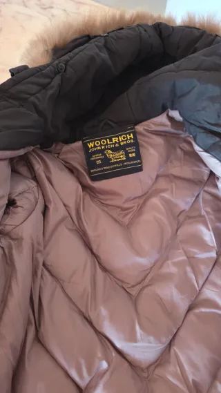 Parka Woolrich in tonalità nera, con cappuccio bordato in pelliccia rimovibile. - Chiusura centrale con zip e bottoni. Segnalo mancanza dei cursori . - Tasche frontali con patta. - Polsini antivento.Tessuto impermeabile.
