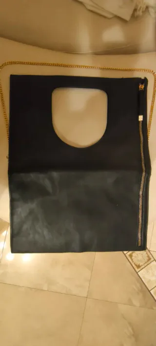 Elegante borsa a mano in pelle nera, perfetta per completare un look da sera. La tracolla a catena dorata aggiunge un tocco di classe. - Chiusura con zip. - Dettaglio cut-out frontale. - Catena metallica color oro.