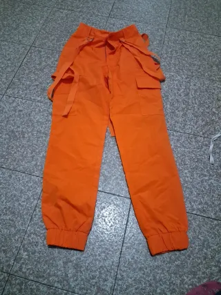 Pantaloni cargo in un vivace colore arancione, perfetti per un look casual e alla moda. - Design con tasche cargo. - Dettagli con lacci regolabili. - Vita elasticizzata alla caviglia.