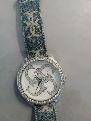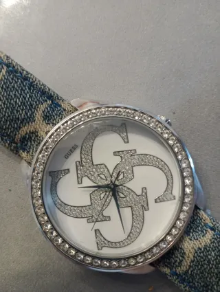 Elegante orologio da polso Guess con quadrante bianco e dettagli luminosi. - Lunetta impreziosita da strass. - Logo Guess sul quadrante. - Cinturino fantasia.
