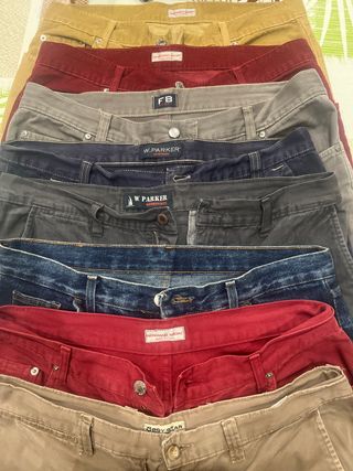 Lotto di pantaloni da uomo in diverse colorazioni e marchi. - Pantaloni in velluto a coste color ocra. - Pantaloni in velluto a coste color bordeaux. - Pantaloni grigi con etichetta FB. - Pantaloni blu navy con etichetta W. PARKER SPORTSMEN. - Pantaloni grigio scuro con etichetta W. PARKER SPORTSMEN. - Pantaloni in denim blu. - Pantaloni rossi con etichetta GERMANO SPORT. - Pantaloni beige con etichetta BOY STAR.
