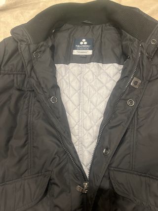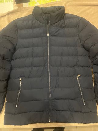 Caldo piumino blu con chiusura a zip frontale e tasche laterali. - Zip frontale. - Due tasche laterali con zip.