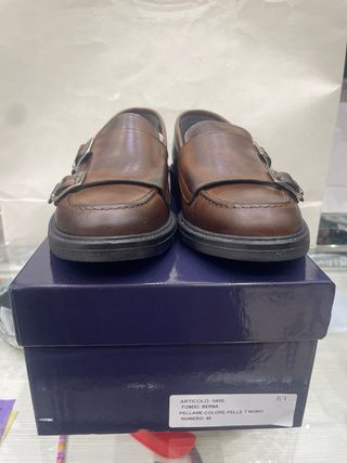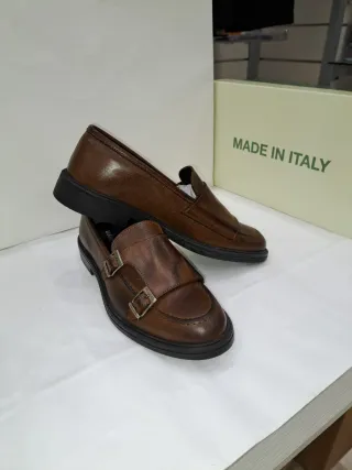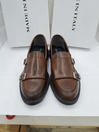 Eleganti scarpe da uomo in vera pelle. Tg. 41 lunghezza della suola interna e di cm. 26,5 prodotto di alta qualità ad un prezzo eccezionale prezzo di fabbrica. Calzata comoda. - Modello monk strap con fibbie. - Dettagli cuciti sulla punta. - Suola in gomma resistente.