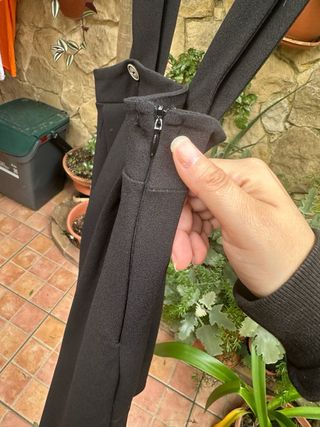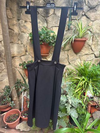 Gonna con bretelle in tessuto nero. - Dettaglio con bottoni. - Gonna svasata.