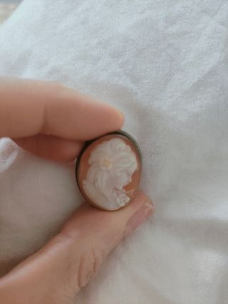 Spilla antica in argento 800 e cammeo raffigurante il viso di una donna. Nella parte interna della spilla vi è una scheggiatura ( vedi foto). Inoltre la chiusura risulta difettata ossia tende ad aprirsi.