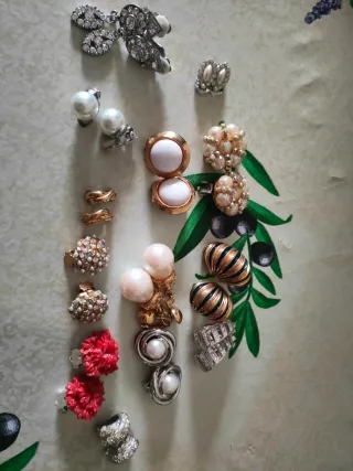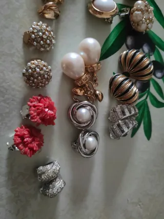 Un assortimento di orecchini vintage per arricchire il tuo stile. - Design a grappolo con perle. - Orecchini pendenti con strass. - Modelli a clip con perle e dettagli dorati. - Orecchini a forma di fiore rosso. - Orecchini con perle e design a spirale. - Orecchini a forma di foglia con strass.
