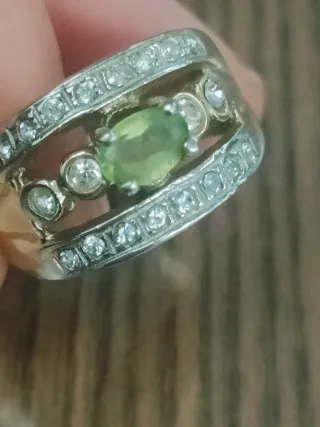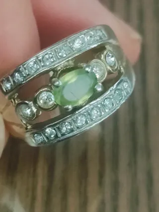 Elegante anello vintage in argento 800, caratterizzato da una pietra centrale di colore verde e dettagli luminosi. - Design unico con pietra ovale verde. - Incastonatura con pietre trasparenti. - Argento 800.