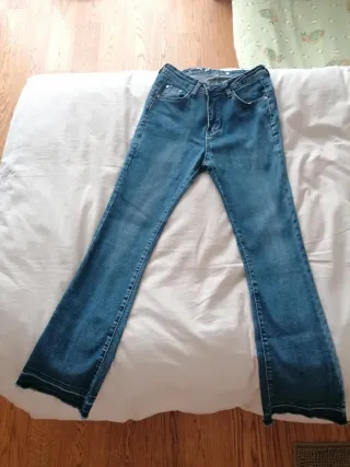 Jeans blu con un taglio a zampa. - Vita media. - Fondo svasato. - Dettaglio sfrangiato sul fondo.