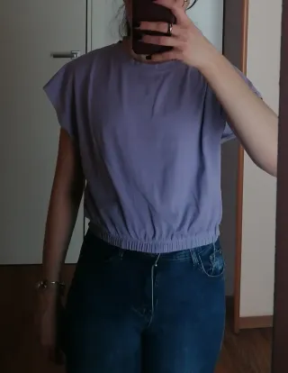 T-shirt corta in un bel colore lilla. Ha un elastico in vita che crea un effetto arricciato. - Maniche corte a sbuffo. - Girocollo.