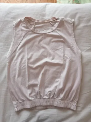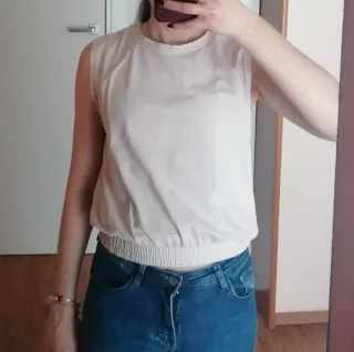 T-shirt senza maniche dal taglio moderno e confortevole. - Colore beige neutro. - Tessuto leggero e traspirante. - Orlo elasticizzato in vita.