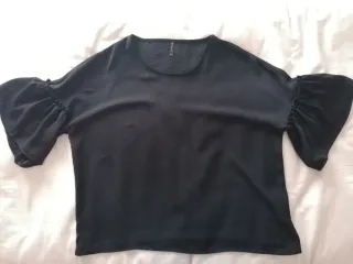 Elegante blusa nera con un design particolare sulle maniche. - Maniche a 3/4 con arricciatura. - Tessuto leggero e fluido.