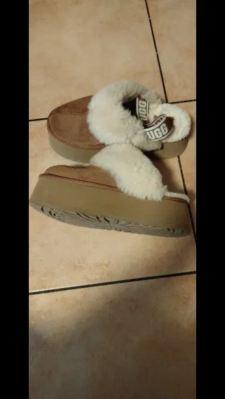 Comode ciabatte UGG con un design moderno e accattivante. - Tomaia in scamosciato marrone. - Morbida pelliccia sintetica bianca. - Suola platform spessa.