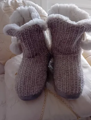 Morbide ciabatte imbottite per stare comodi in casa. - Fodera interna in peluche bianco. - Dettaglio con lacci e pompon bianchi. - nuove