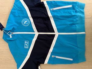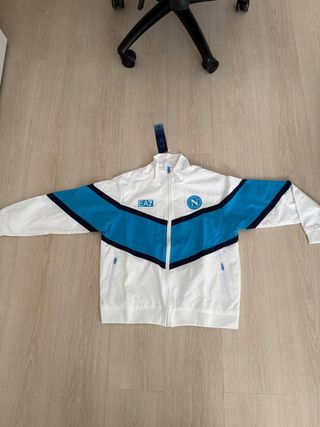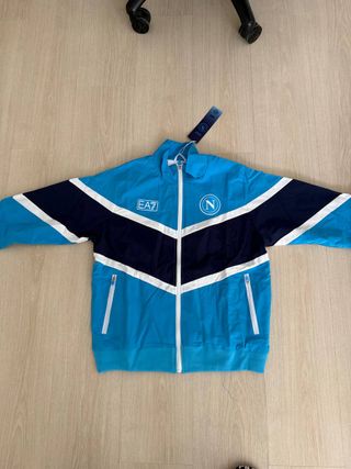 Giacca a vento EA7 del Napoli, colore azzurro con inserti bianchi e blu scuro. Presenta il logo EA7 su un lato e il logo del Napoli sull'altro. - Zip frontale. - Tasche laterali con zip.