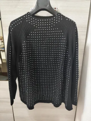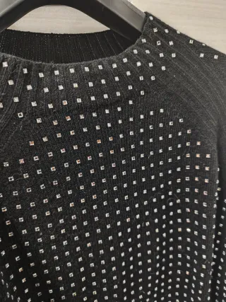 Elegante maglia nera impreziosita da una pioggia di strass. - Design con strass quadrati. - Maniche lunghe. Marca Oltre Taglia XL Usata mezza giornata praticamente nuova È molto luminosa con vari riflessi con spacchi laterali Purtroppo per me è un po' grande