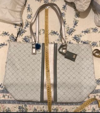 Borsa Carpisa Penelope Cruz, un accessorio elegante e capiente. - Colore: argento e bianco. - Design con motivo a rombi. - Dettagli a contrasto lungo la chiusura centrale. - Manici in ecopelle. - Charm pendente con logo.