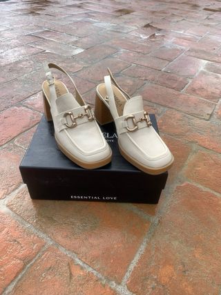 Eleganti tacchi Carmela in tonalità beige con dettagli dorati. - Design slingback con tacco largo. - Fibbia decorativa sul davanti. - Suola in gomma.