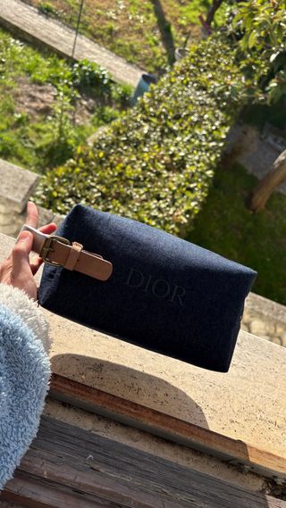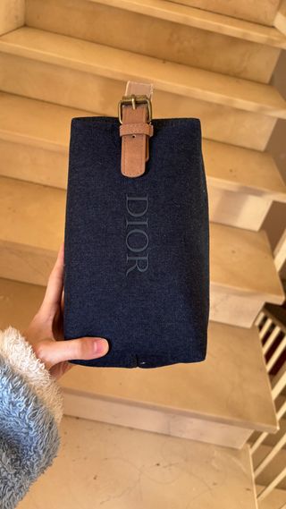 misura 21x12x10cm Elegante trousse Dior in denim blu, perfetta per organizzare i tuoi effetti personali. - Dettagli in pelle marrone. - Logo Dior inciso sul davanti.