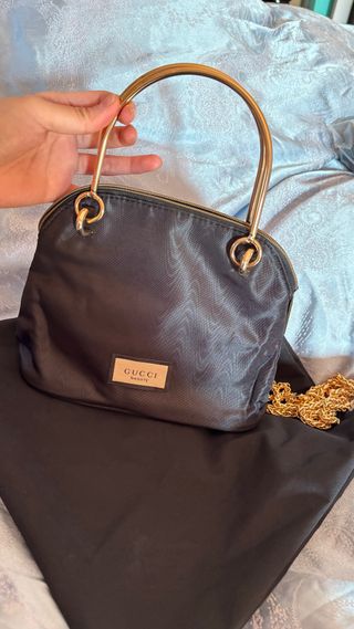 misura:19x15x7cm. catena regolabile.manico un po’ graffiato. Elegante pochette Gucci, perfetta per ogni occasione. Realizzata in tessuto nero con manico dorato - Logo Gucci sul fronte. - Manico rigido dorato. - Catena dorata per portarla a spalla o a mano.