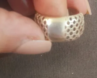 Anello Stroili in argento, modello mezza fascia. - Design traforato con motivo esagonale. - Parte centrale impreziosita da piccoli zirconi luminosi.