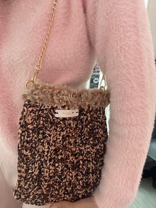Borsa artigianale realizzata all'uncinetto con fantasia leopardata. Dotata di una pratica catena dorata per essere indossata a tracolla. - Finitura superiore in pelliccia sintetica. - Etichetta Hand Made applicata.