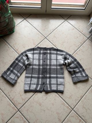 Cardigan oversize da donna con fantasia a quadri. - Fantasia a quadri grigio e bianco. - Maniche lunghe. - Orlo e polsini a costine.