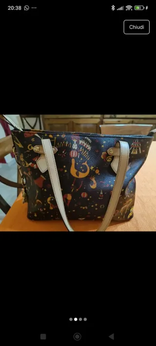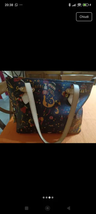 Borsa con una fantasia vivace e colorata. - Manici in ecopelle chiara. - Dettagli dorati. - Chiusura con zip.