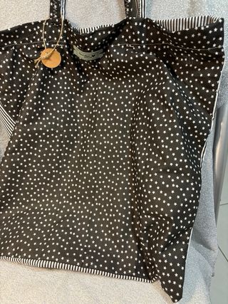 Borsa tote handmade con un design unico che unisce un tocco vintage e glamour. Perfetta per chi ama distinguersi. - Fantasia a stelle bianche su sfondo nero. - Dettagli a righe. - Manici comodi per il trasporto.