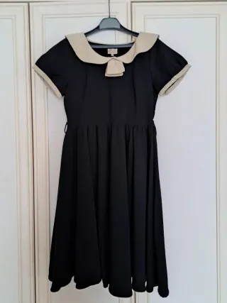 Elegante abito da donna Lindy Bop, perfetto per ogni occasione. Presenta un design raffinato con dettagli curati. Color nero e crema tenuto perfettamente per uno stile autentico 65% poliéster, 30% viscosa, 5% elastano Spalle cm 38 Ascella ascella cm 50 Vita cm 45 Manica cm 20 Lunghezza gonna cm 68 Lunghezza totale cm 107 - Colletto a contrasto beige. - Fiocco decorativo sul colletto. - Maniche corte a sbuffo. - Gonna ampia e fluida.
