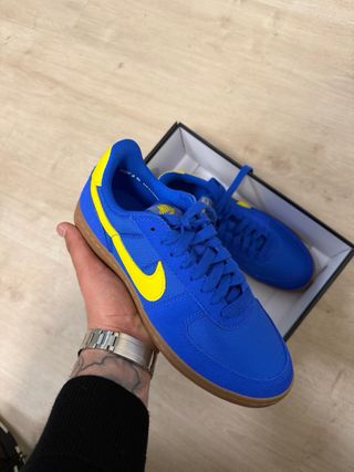 Scarpe Nike Field General con una combinazione di colori vivace. - Tomaia in tessuto blu. - Swoosh Nike giallo. - Suola in gomma marrone.