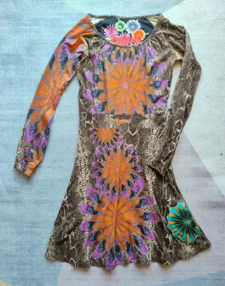 Vestito Desigual originale, un pezzo iconico e super colorato, perfetto per chi ama lo stile boho-chic. ✨ Dettagli che lo rendono unico: Design: Base con stampa animalier (pitonata) sui toni del marrone/fango, arricchita da grandi fiori mandala in arancio, viola e turchese. Particolari: Logo Desigual ricamato in rilievo sul petto e sulla schiena. Rifiniture con impunture a vista color oro che danno un tocco di luce. Fit: Taglio leggermente svasato (a trapezio) che valorizza la silhouette senza stringere. Composizione: Mix di Cotone (55%) e Viscosa (45%). Il tessuto è morbido, leggermente elastico e molto confortevole sulla pelle.