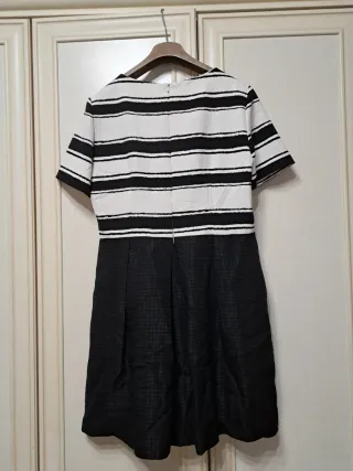 Elegante abito da cocktail con fantasia a righe sulla parte superiore e gonna a fantasia geometrica. Made in italy per uno stile chic bon ton Spalle cm 41 Ascella ascella cm 50 Manica cm 23 Vita cm 45 Lunghezza tot cm 93 Gonna cm 51 - Fantasia a righe orizzontali. - Gonna con texture a scacchiera. - Maniche corte.