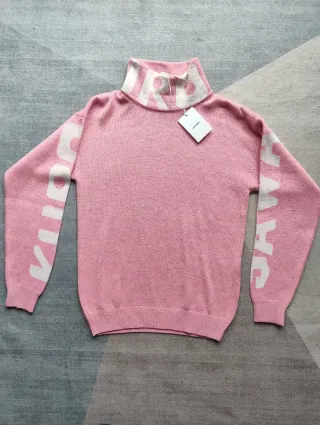 Bellissimo maglione a collo alto (modello dolcevita) firmato Takeshy Kurosawa, brand iconico del Made in Italy. Il colore è un rosa pastello vivace, perfetto per illuminare l'inverno o per i primi freschi primaverili. Caratterizzato da maxi scritte a contrasto bianco con il nome del brand panna sulle maniche e sul collo, che donano un tocco street-chic unico. ✨ Dettagli del capo: Condizioni: Nuovo con cartellino (mai indossato). Taglia: M (vestibilità regolare/comoda). Composizione: Pregiata miscela 50% Lana Merino 50% Acrilico (caldo, morbido sulla pelle e non punge). Modello: Dolcevita Sawa Jaquard (Art. 82353). Colore: Rosa