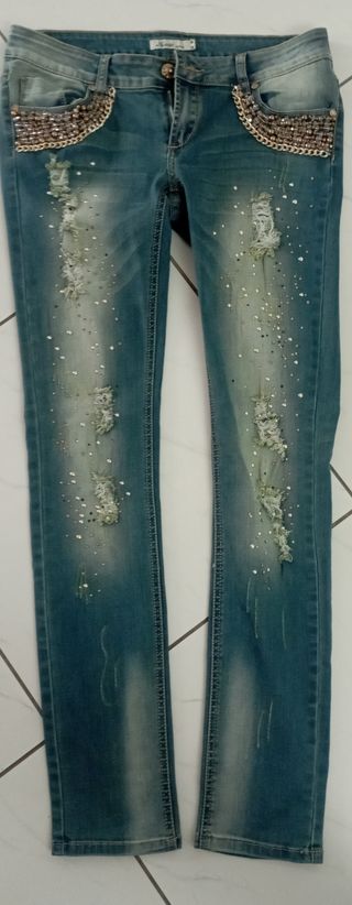 Bellissimo jeans donna super glamour, con strass, borchie, catene e perle, super elegante . Veste meno della taglia 48
