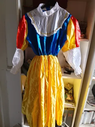 Vestito da carnevale per bambina, ideale per feste e travestimenti. - Maniche a sbuffo con dettagli rossi e gialli. - Gonna ampia e fluente. - Colletto bianco.