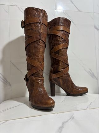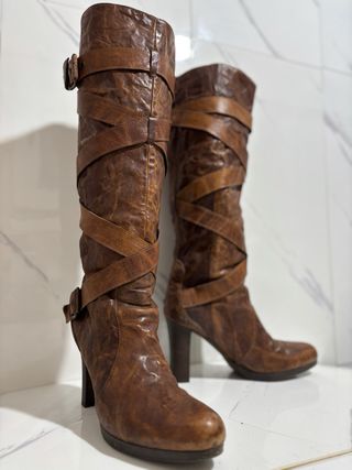 Eleganti stivali alti fino al ginocchio con un design unico. - Materiale in pelle effetto invecchiato. - Dettagli con cinturini incrociati. - Fibbia decorativa sul lato. - Tacco robusto e plateau anteriore