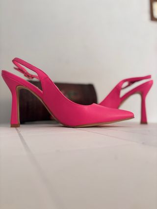 Eleganti décolleté fucsia con un dettaglio scintillante sulla punta. - Design a punta. - Dettaglio gioiello decorativo sulla tomaia. - Modello slingback con cinturino alla caviglia.