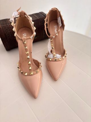 Eleganti scarpe décolleté con cinturino e borchie. - Modello T-bar - Dettagli borchiati dorati - Punta affilata