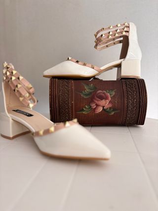 Eleganti décolleté con un design moderno e dettagli ricercati. - Tomaia in vernice bianca. - Cinturino alla caviglia con borchie. - Tacco basso e comodo.