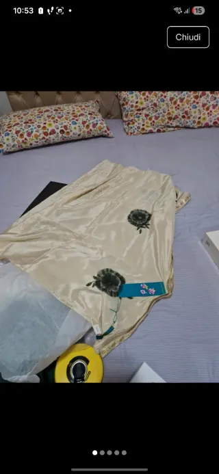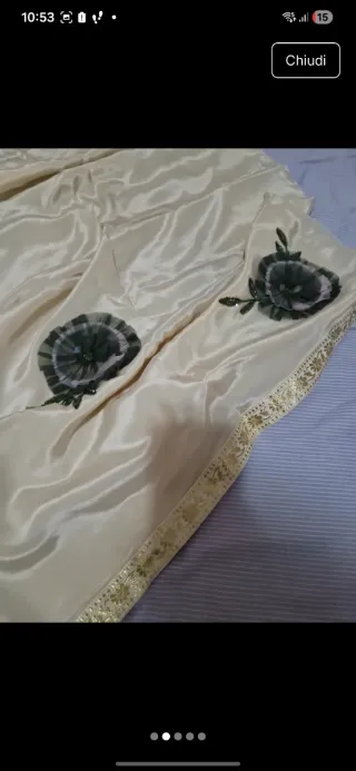 Elegante stola nuova, perfetta per completare un outfit. - Tessuto satinato color beige. - Dettagli floreali applicati. - Bordatura dorata decorata.