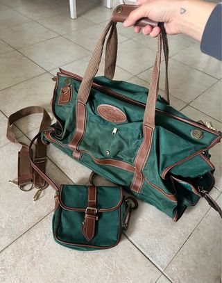 Borsone da viaggio vintage con tracolla abbinata. Un accessorio pratico e stiloso. - Dettagli in pelle marrone. - Tessuto resistente.