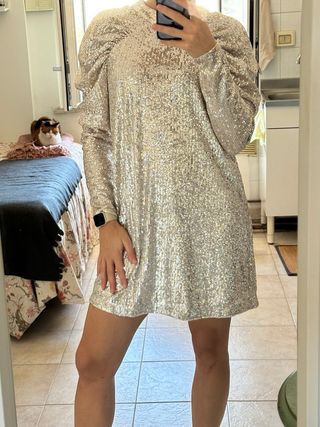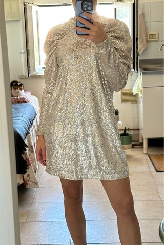 Elegante vestito corto interamente ricoperto di paillettes che catturano la luce. - Maniche lunghe con volume sulle spalle. - mai indossato
